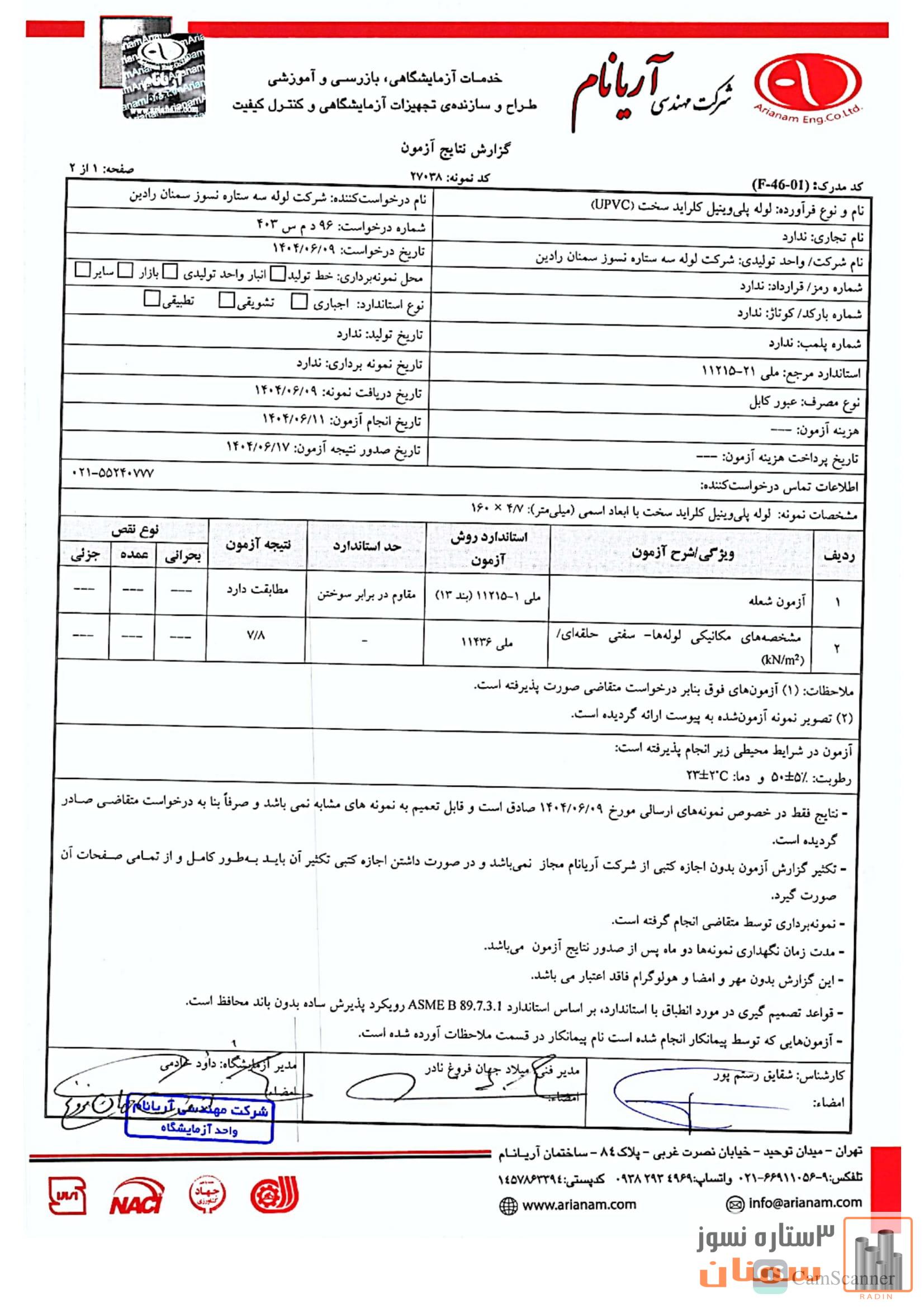 نتایج آزمایش لوله های پی وی سی 1404